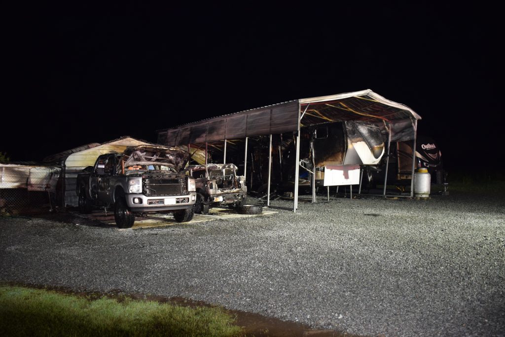 Johnston County Fire Marshal Adam Stanley said the owner was awakened by a loud boom and looked outside and saw the fire. A Ford F-250 truck, Jeep Wrangler, boat, two campers, lawnmower and a UTV along with the buildings were destroyed.