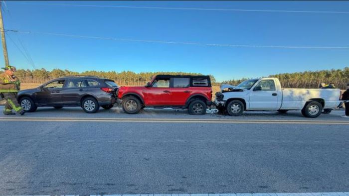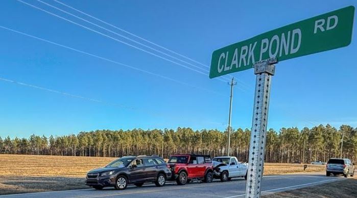 Just before 4:00pm Wednesday, a northbound vehicle was stopped waiting to turn left onto Clark Pond Road. Two other vehicles stopped behind the turning car. A white pickup truck did not stop and slammed into the red Ford Bronco which in turn struck the green Subaru.