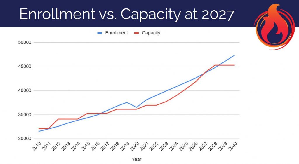 Presently, there are 8,836 middle school students. That number will grow to 9,587 in 10 years. And in a decade, high school enrollment will increase from 11,313 this year to 13,961 in 2032.