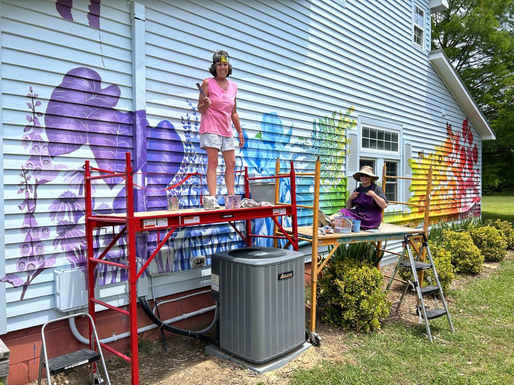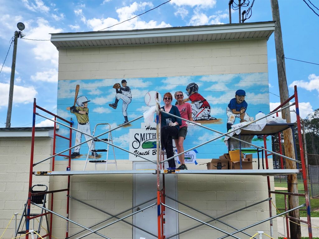 The Smithfield Civitan Park mural was done by Judy Boyette and Loretta Langdon; a beautiful piece of art celebrating recreation and the sport of baseball. In addition, the barn at Artmosphere Community Arts Center now has a colorful piece celebrating native plants by Barb Tucker and Diana Fernandez.