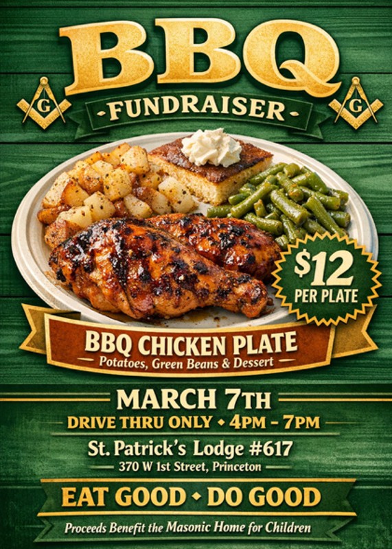 PRINCETON — St. Patrick’s Masonic Lodge #617 is preparing for its annual BBQ chicken fundraiser to benefit the Masonic Home for Children at Oxford.