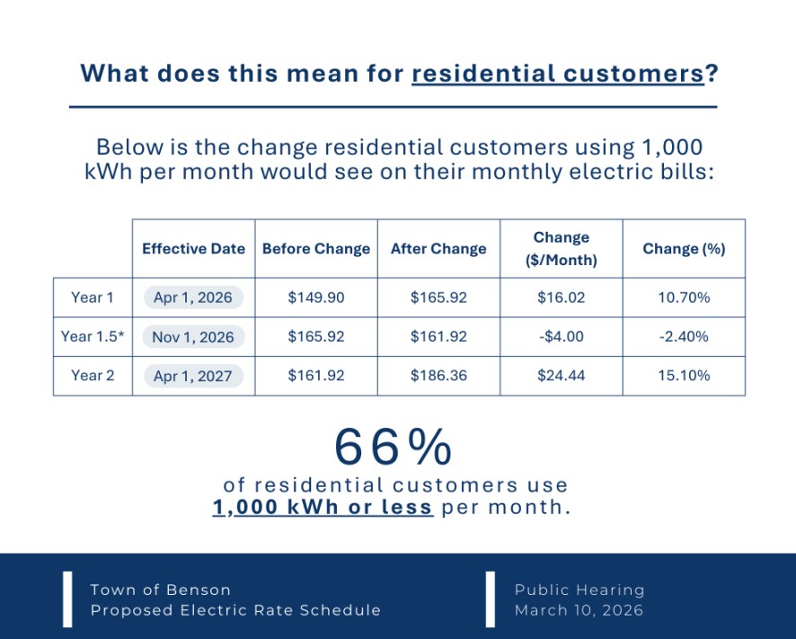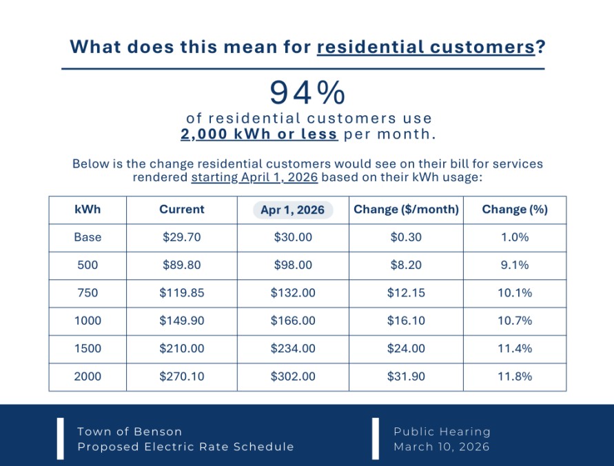 The hearing is scheduled for March 10 at 7 p.m. at the Benson Conference Center, 303 E. Church St., and will allow residents and businesses to comment on proposed modifications to the town’s electric rate schedule.