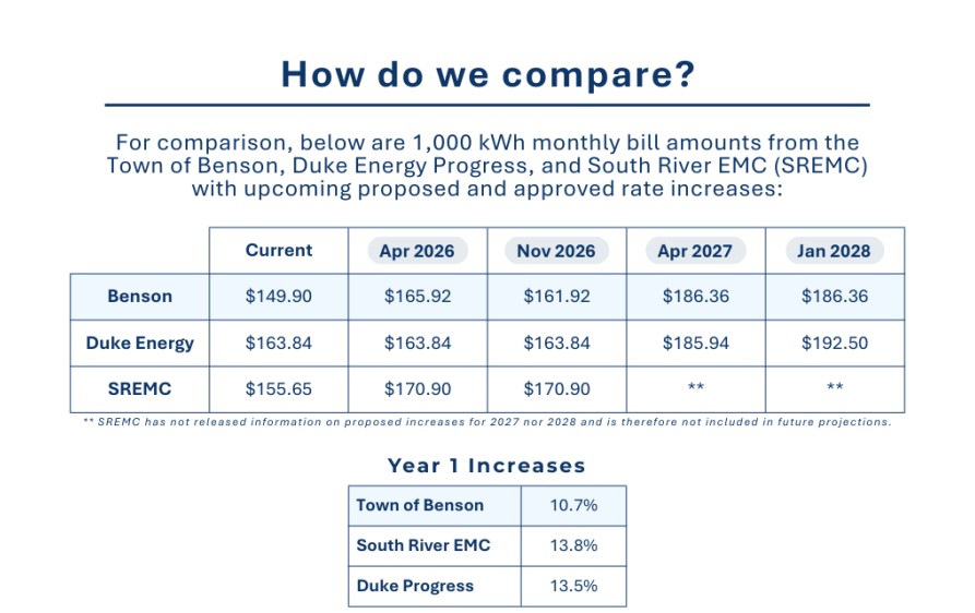 Town of Benson officials cited rising wholesale power prices as a major factor behind the proposed changes. Benson is one of 32 members of the North Carolina Eastern Municipal Power Agency (NCEMPA), which purchases electricity from Duke Energy and sells it to member municipalities.