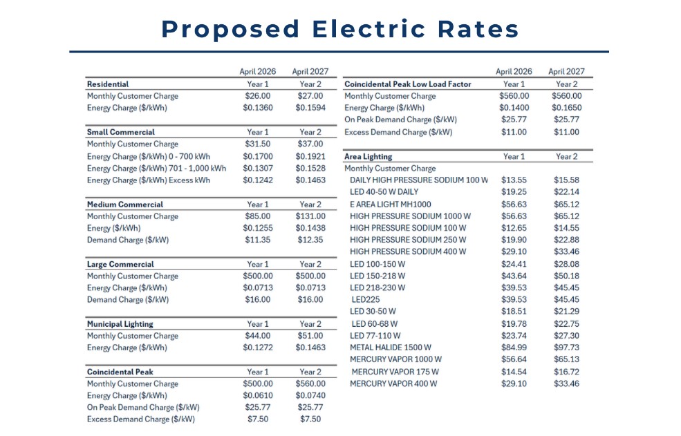 Officials emphasized that the proposed rates are structured to recover costs fairly across customer classes while maintaining service reliability.
