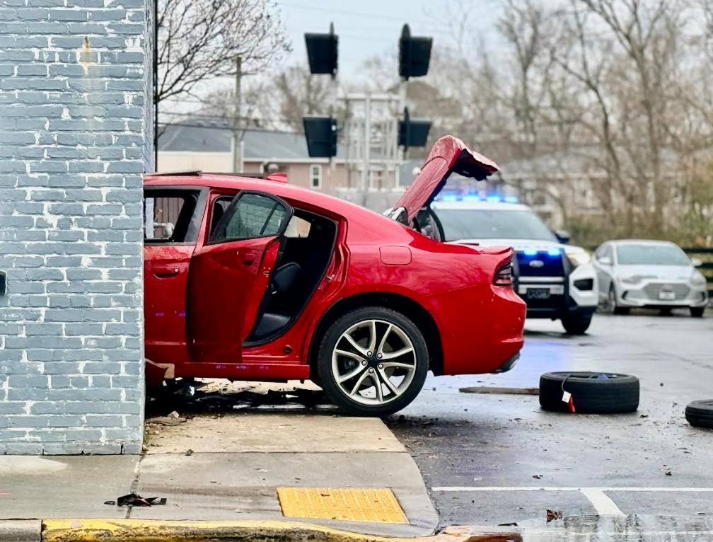 The incident occurred around 10:40 a.m. at Vinson’s Pub + Eatery, located at 800 E. Main Street. According to authorities, a red passenger vehicle veered off the roadway and traveled through two yards before crashing into the building.