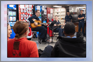 U.S. Navy Lt. Cody Walker, left, from Smithfield, North Carolina, and Lt. Cmdr. James Trogden, from Mines City, Montana, perform for Sailors on the mess decks during an ice cream…