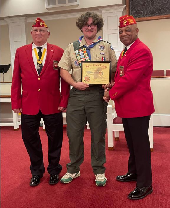 During his Eagle Scout Court of Honor, Houston was presented with an Eagle Scout Good Citizenship Award from Eagle Scout Coordinator (left) Bob Long, Past Commandant and (right) Bo Durham on behalf of the Commandant Bill Dunn Johnston County Marine Corps League Carry-On Detachment 1236.