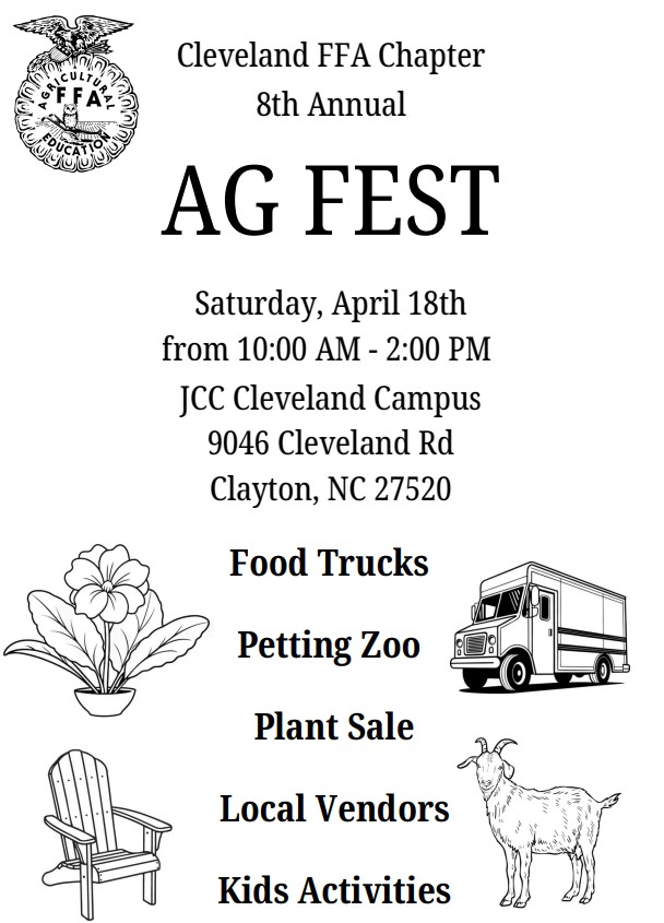 CLAYTON, N.C. — The Cleveland FFA chapter will host its eighth annual Ag Fest on April 18 at Johnston Community College’s Cleveland Campus, offering a day of family-friendly activities and local vendors.