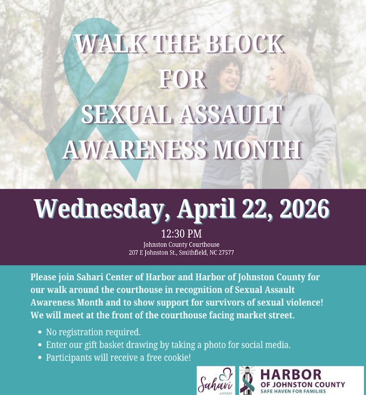 SMITHFIELD, N.C. — In recognition of Sexual Assault Awareness Month, the Sahari Center and Harbor of Johnston County are inviting the community to participate in a “Walk the Block” event on Wednesday, April 22.