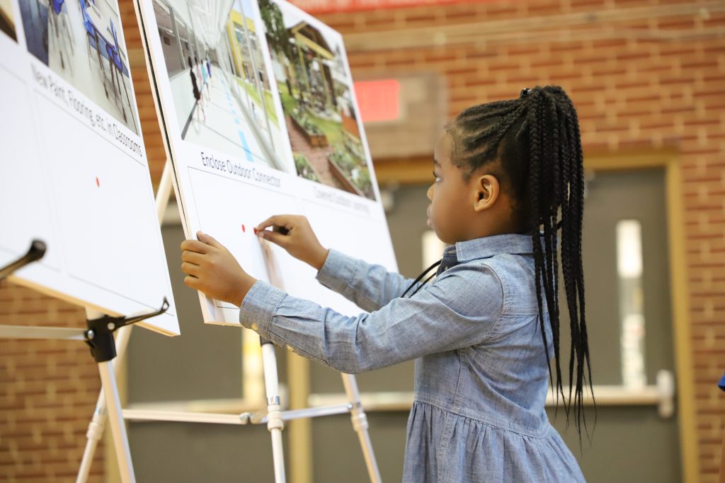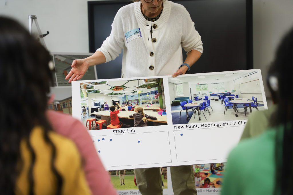 Each student was then given a colored dot sticker to place next to what they would like to see happen as part of the projects. Students then had an opportunity to select one of the following project options: STEM lab; new paint, flooring, etc. in classrooms; open play field; basketball court and hardscape play area; enclosed outdoor connector; covered outdoor learning space; larger art class and outdoor patio; and a larger music classroom.