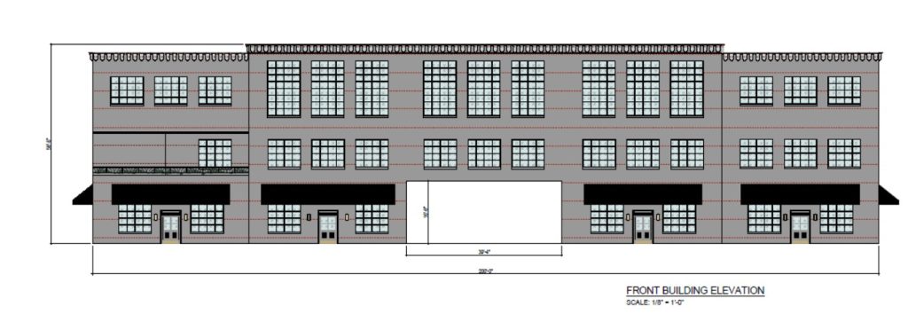 Plans call for a 51-foot-tall building — exceeding the standard 40-foot height limit in the B-2 zoning district through an approved conditional zoning deviation — designed to mimic traditional downtown architecture. The 41,940 sf. ft building will feature minimal front setbacks along East Market Street with parking located behind the building.