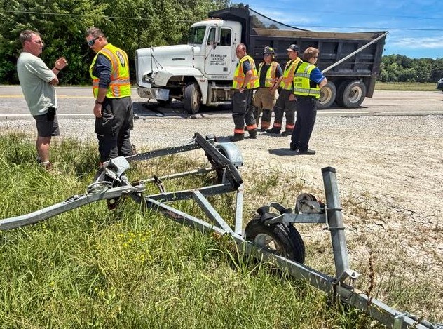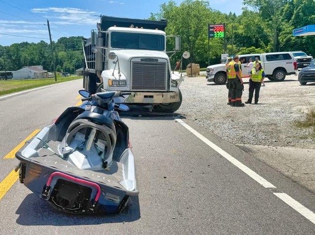 The dump truck driver avoided the pickup but collided with the trailer, sending the jet ski onto the highway.