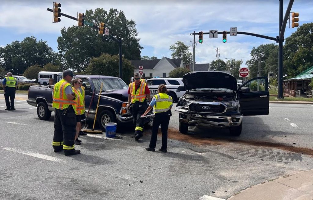 The collision involved two pickup trucks. Two minor injuries were reported.