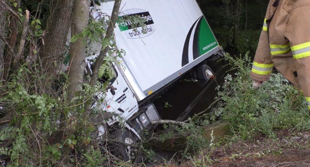 Newton Grove Fire arrived to find the box truck had slammed into a tree in the edge of a swamp. The driver was pinned in the cab.
