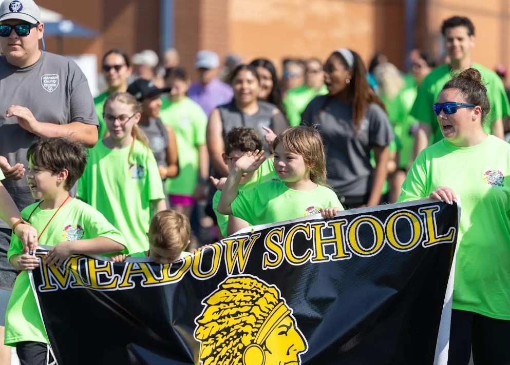 Then, teams paraded around the track to the cheers of the families and friends gathered in the stands. The athletes and coaches showcased their schools by carrying banners and signs and bringing lots of excitement to the day they had trained for all year.