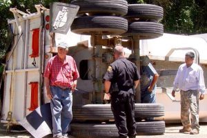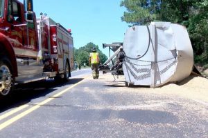 The truck, carrying wheat from a farm near Clinton, overturned spilling its cargo in the roadway. Crews had to shut down the roadway and the Department of Transportation set up a detour until the wreckage could be removed and the spilled wheat cleaned up.