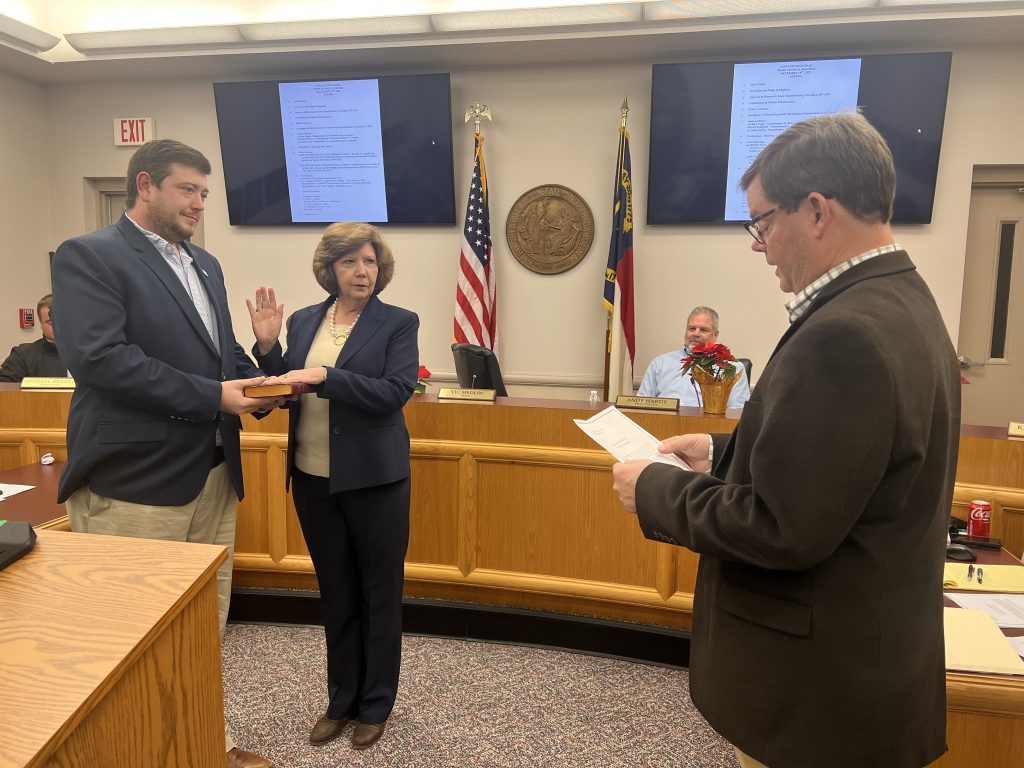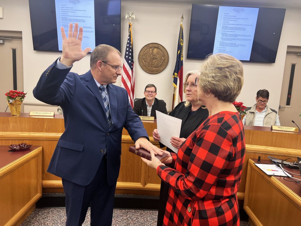 Incumbent commissioners Kim Robertson and Carles Surles were sworn in by Mayor Vic Medlin.