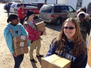 The girls spent the day packing food supplies consisting of fresh produce, grains, meats, dairy and water for members of the community and carried the boxes filled with food to the trucks to be transported.