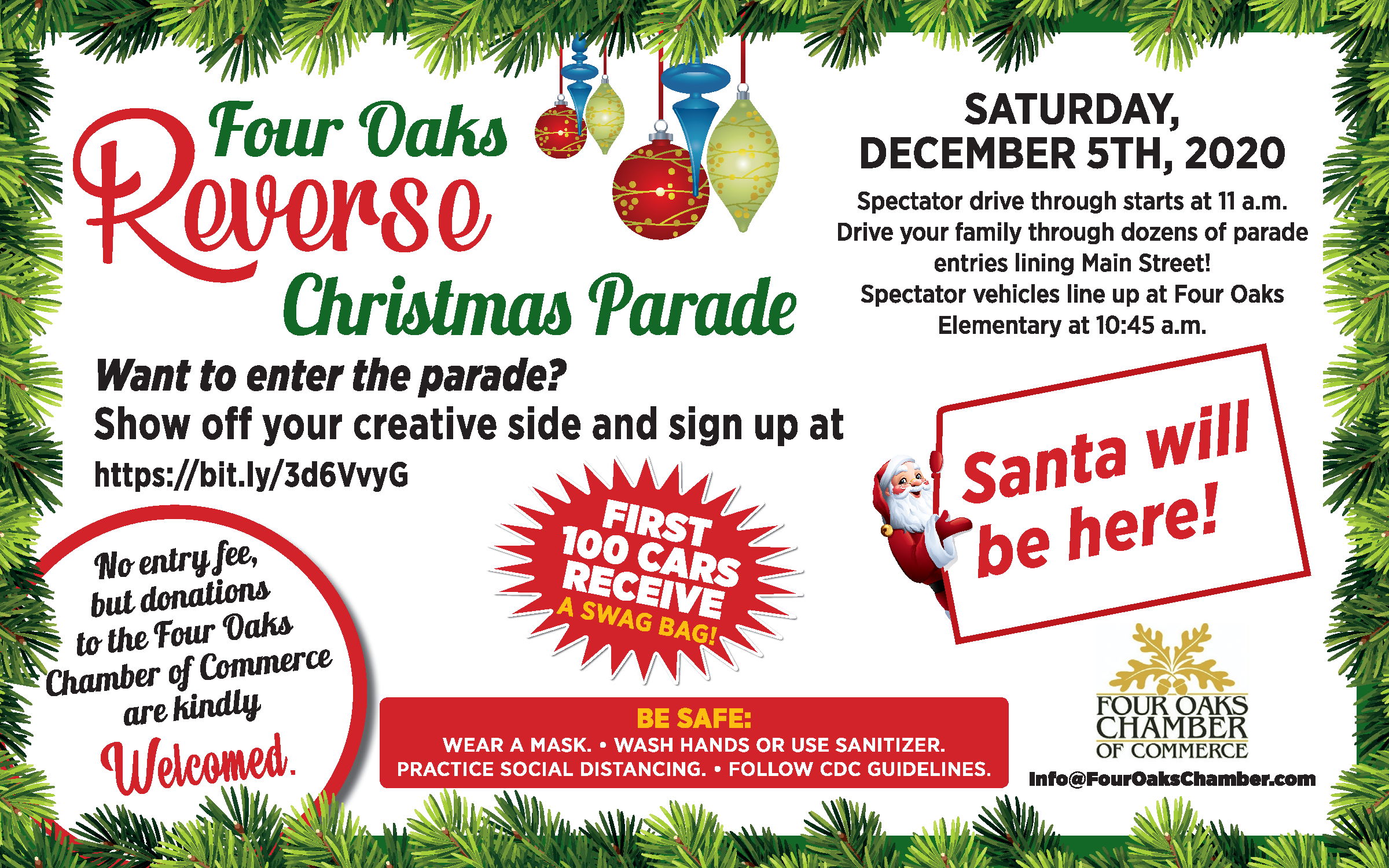 “It was really important to us that after all the event cancellations and delays that we find a way to host our annual Christmas parade. Part of the mission of the Four Oaks Chamber of Commerce is to provide opportunities for our members to connect with our community,” said Joan Pritchett, Director of the Four Oaks Chamber of Commerce. “Building a strong community is vital to the growth of businesses. We anticipate that the “Reverse Parade” will be fun for all while being able to achieve our mission safely.”