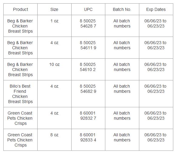 The products are sold under the brand names: Beg & Barker Chicken Breast Strips Dog Treat, Billo’s Best Friend Chicken Breast Strips Dog Treat and Green Coast Pets Chicken Crisps Dog Treats.