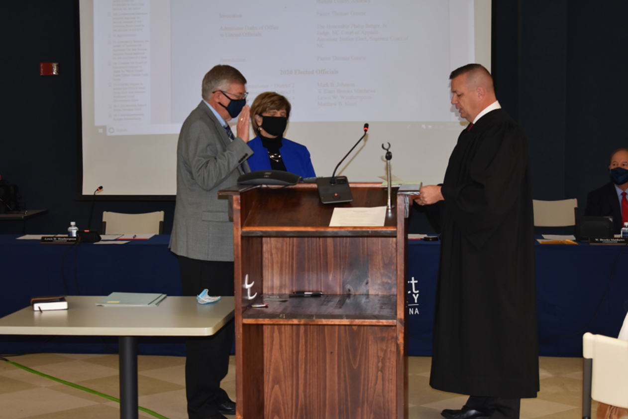 Incumbent District 2 Commissioner Mark B. Johnson and District 3 Commissioner W. Brooks Matthews were sworn in to their first full terms on the Board after both were appointed to fill vacant seats on the Board. Johnson joined the Board on July 15, 2019, following the passing of former Commissioner Abe Elmore, and Matthews joined the Board on Oct. 5, 2020, following former Chairman Howard Penny’s resignation to serve in the North Carolina House of Representatives. Both commissioners won their first elections for their seats on November 3.
