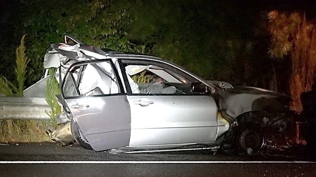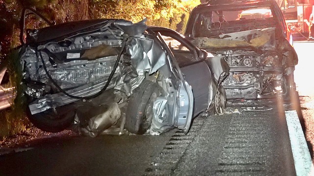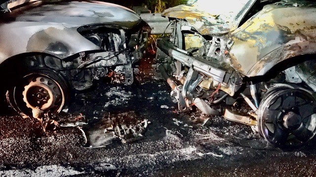 A backseat passenger wisely insisted that all occupants exit the vehicle while the tire was changed. Moments later he yelled, “Get out of the road, get out of the road” and pushed his girlfriend out of the way when he spotted an SUV speeding right toward them. The SUV struck the Honda at 70 mph and both vehicles traveled down the road for nearly 150 feet before bursting into flames.