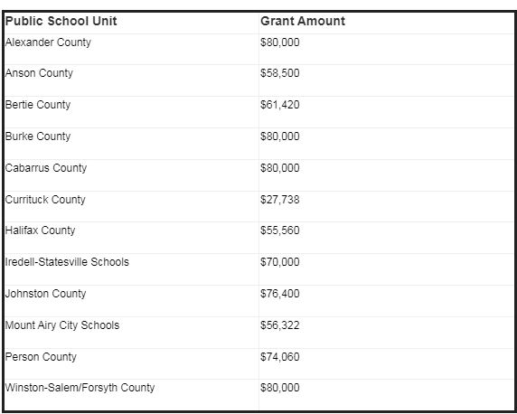 The North Carolina schools named as grant recipients are: