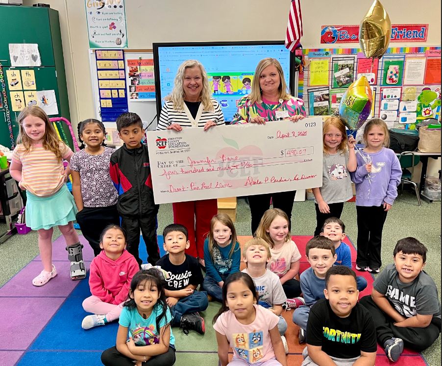 Merv Sessom Grant Winner Jennifer Bare, Pine Level Elementary, Darla Peedin Executive Director, Jennifer Bare and her Kindergarten class.
