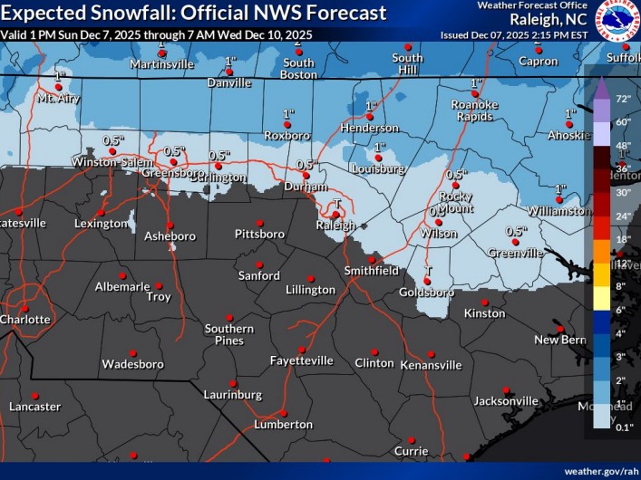The National Weather Service predicts up to half an inch of snow locally, with higher amounts—up to 2 inches—possible closer to the North Carolina–Virginia line. Rain is expected to develop Monday morning before transitioning to a rain-snow mix around midday.