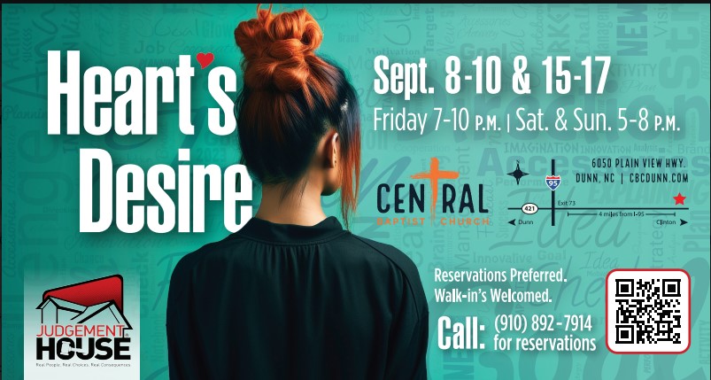 DUNN – Experience the thought-provoking journey of Judgement House this year on September 8-10 and 15-17, 2023. Join Central Baptist Church for the annual immersive theatrical presentation that delves into the eternal consequences of life’s choices.