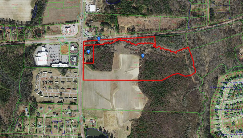Three tracts of land at a busy Cleveland area intersection has been rezoned. Johnston County Commissioners rezoned the three parcels totaling 35.2 acres on Highway 50 at Highway 42 in the Cleveland Township from Agricultural Residential (AR) to General Business (GB). The property is on the southeast corner of the intersection.
