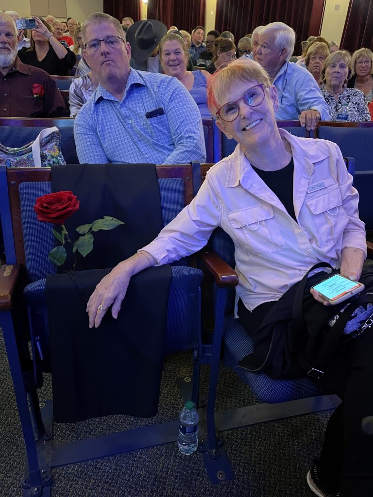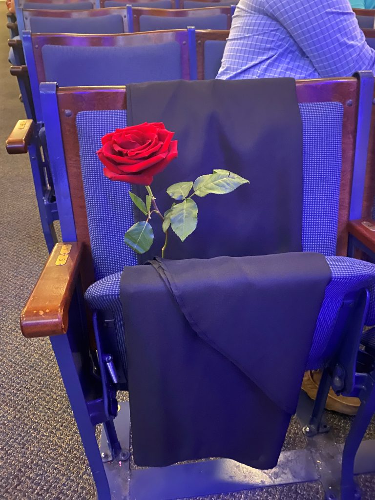 So Langston invited the family to come to the show. More than 20 seats were sold to family members, with 16 of those purchased as a group in the first four rows just to the left of the stage. One of those seats was singled out in honor of Rose and left empty, draped only with a black cloth and adorned with a single red rose.