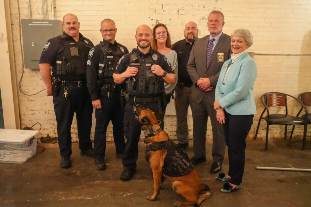 CLAYTON – The Clayton Police Department has an additional safeguard for one of its officers, thanks to the generosity of a local club. Clayton Area Runners (CAR) presented a K9 ballistic vest to Master Officer Stephen Carter and K9 Officer Tim on Thursday, January 25, 2024, during a gathering at Deep River Brewing Company at 700 W. Main Street, Suite 102. “This donation means another K9 has the additional equipment, which traditionally is not provided by law enforcement agencies across the county, to keep their handler, other officers, and the citizens of Clayton safe when those dangerous situations arise,” says Sergeant G.M. Morris.