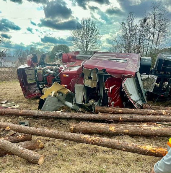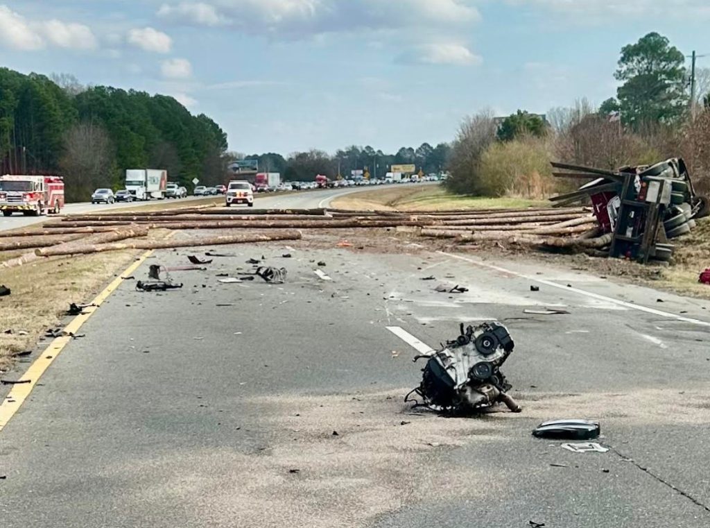 The crash occurred around 12:45 p.m. on U.S. 70 eastbound. According to emergency responders, a tractor-trailer collided with a passenger car, knocking the engine out of the car upon impact. The truck then overturned, spilling logs across the eastbound lanes of the highway.