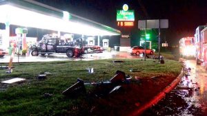 Damage to the wrecker was placed at $9,000. Damage to the gasoline tanker was estimated at $1,000. And damage to the repossessed car attached to the wrecker was placed at $1,800. A fuel pump in the convenience store parking lot sustained $500 in damage as a result of the crash.