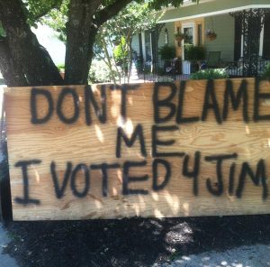 Wiesner placed signs in the front yard of his home on US 301 in Micro expressing his frustration. One sign read, “Don’t Blame Me I Voted 4 Jim” and another said, “I Don’t Drink The Cool-Aid.”