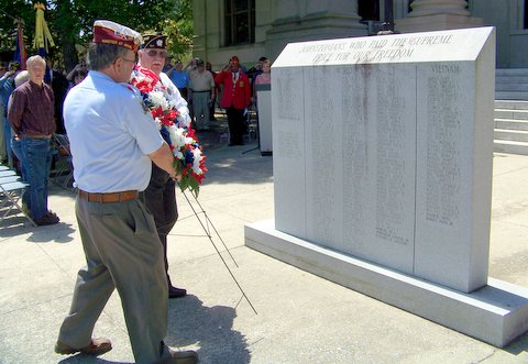 A wreath was then placed in front of a monument that lists the names of Johnston County residents who have died in war. The American Legion Post 109 Honor Guard Team then fired a 21 gun salute, which was followed by the playing of Taps by Ken Parker with the Marine Corps League Detachment 1236.