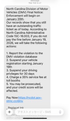 RALEIGH – The N.C. Division of Motor Vehicles (NCDMV) is warning North Carolinians about a new wave of scam text messages threatening license suspension, fines, and other penalties.