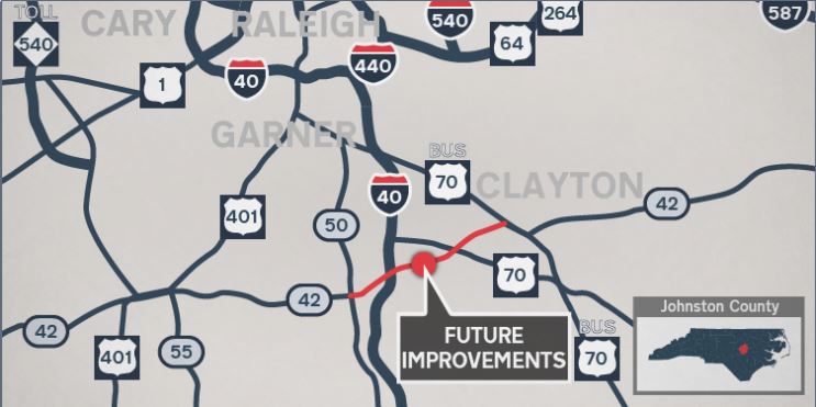 The state agency plans to widen an eight-mile stretch of N.C. 42 between U.S. 70 Business and N.C. 50, which is west of Interstate 40 at Exit 312. The mostly two-lane highway would be widened to four lanes with a raised median, similar to the project nearing completion to widen N.C. 42 east of Glen Laurel Road in fast-growing Clayton. The project would improve safety and traffic flow, reduce delays during rush hour and accommodate expected traffic growth.