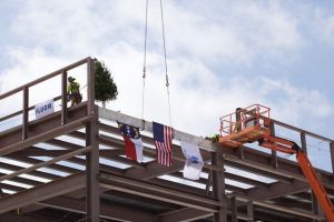 Workers at Novo Nordisk’s manufacturing expansion in Clayton placed the last steel beam on the first building to be constructed during a ceremony on Friday, acknowledging a critical milestone in the development of the new $2 billion site.