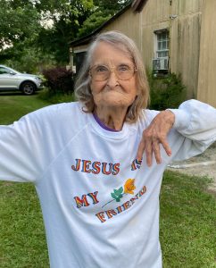 Frances was known to all around as a sweet, kind, and loving person who also had the inner strength of a warrior. She still maintained a garden up to her nineties. She would stand her ground and defend her chickens against snakes, opossums or whatever would dare to take her on. We all loved her quick wit and wonderful sense of humor. Such as her most recent time waiting in the ER getting tired of waiting telling us “I’m ready to tell the ER staff bye just as quick as I said Hi”.