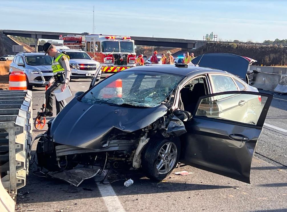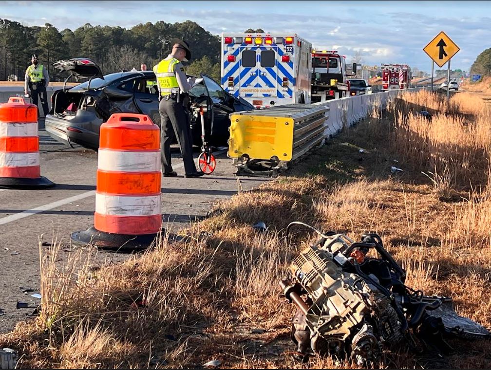 According to the State Highway Patrol, a gray Ford Fiesta was traveling southbound on I-95 at the 81 mile marker. Based on information from an eyewitness and evidence gathered at the scene, the vehicle ran off the interstate to the left, struck the end of a metal guard rail, overturned, and came to rest in the right southbound lane.