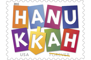 Happy Hanukkah! With eight colorful shapes and the silhouette of a dreidel, this stamp captures the joyous spirit of the Hanukkah festival.