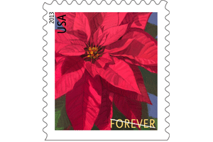 The U.S. Postal Service continues its tradition of issuing classic holiday stamps with this bright and cheerful rendering of America’s favorite holiday flower, the poinsettia.