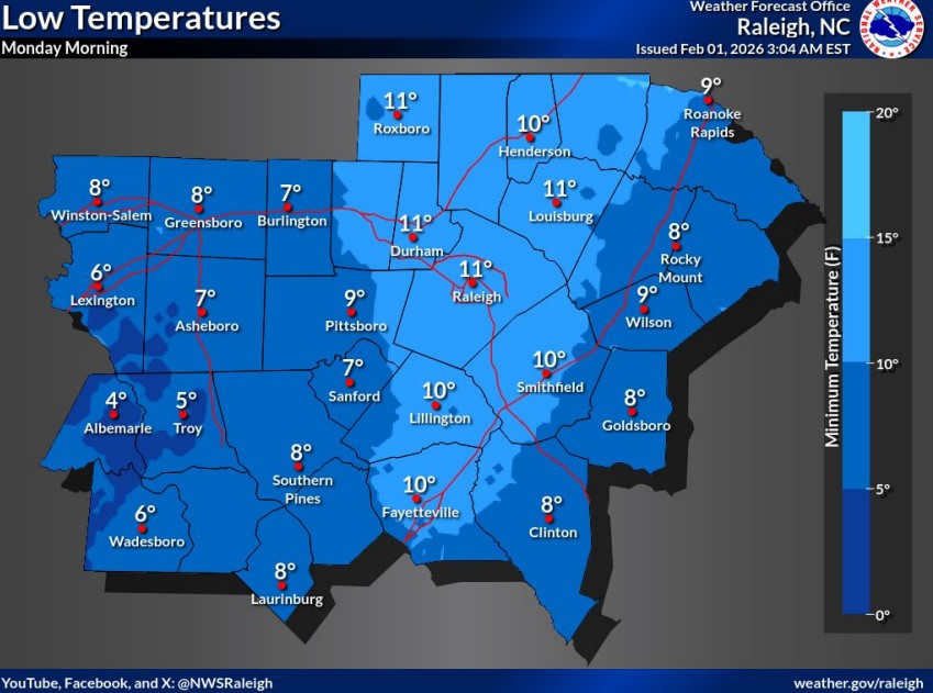 JOHNSTON COUNTY — Dangerous cold and icy road conditions are expected to persist across Johnston County and central North Carolina through Monday morning, prompting multiple weather advisories from the National Weather Service.