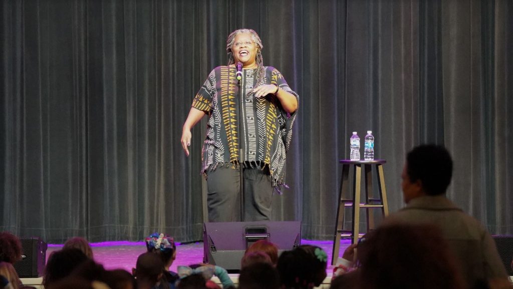North Carolina state Rep. Donna White attended the show. “I was delighted to see and hear elementary students in JCPS delirious with laughter from the unique and creative storytelling skills that author and storyteller Donna Washington shared today. What a wonderful gift Ms. Washington shared with our students today.”