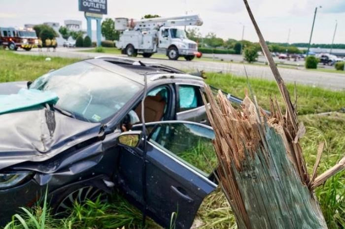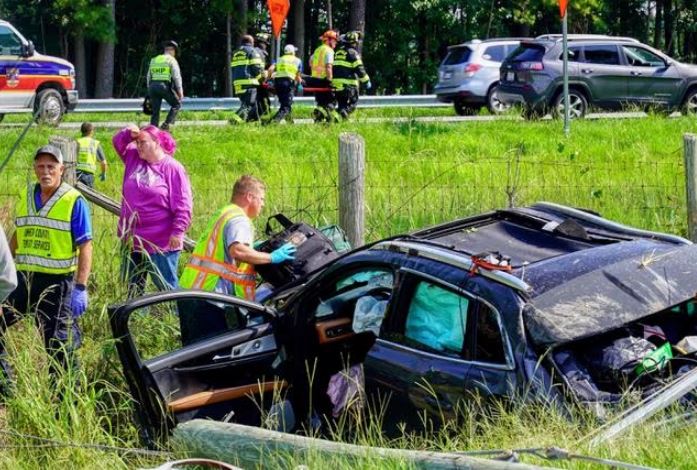 The car drove off the interstate in front of Carolina Premium Outlets, stuck a large tree, crashed through a ditch, then collided with a power pole.