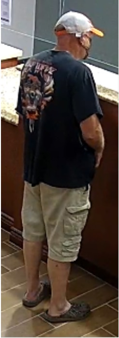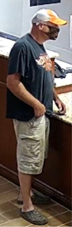 The suspect is described a white male wearing a white and orange ball cap, black COVID-19 style mask, blue t-shirt, khaki cargo pants, and tan crock style shoes. The suspect left in a 2008 or newer model Ford F250 regular cab pickup. The vehicle may have been occupied by a second person, possibly a white female. The truck was last seen leaving the area on Highway 42 headed towards Interstate 40.