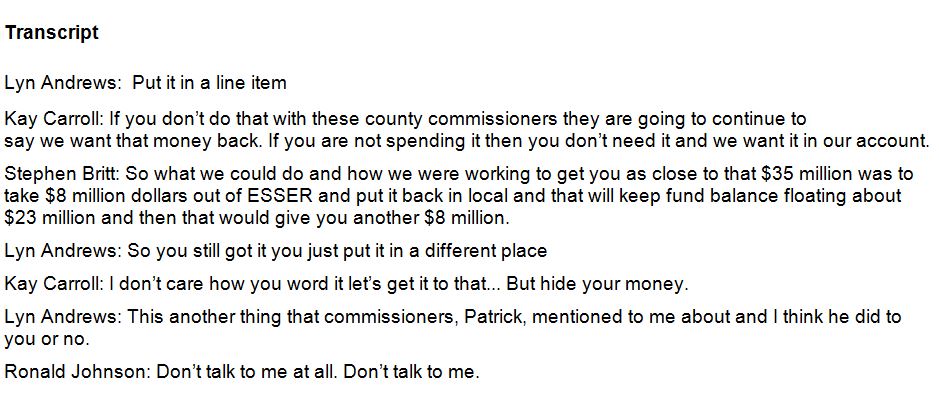School board Kay Carroll reportedly states in the tape, “If you don’t do that with these county commissioners they are going to continue to say we want that money back. If you are not spending it then you don’t need it and we want it in our account.”