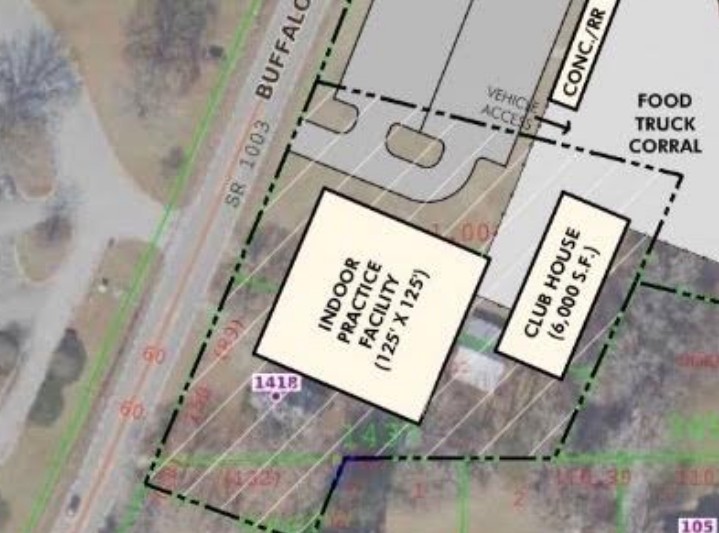However, an initial conceptual drawing obtained by The Johnston County Report shows an indoor practice facility and clubhouse proposed for the site. The two structures are not included in the town’s existing $6 million stadium plan. Whether they will be built on the site is unknown, Councilman Travis Scott said.